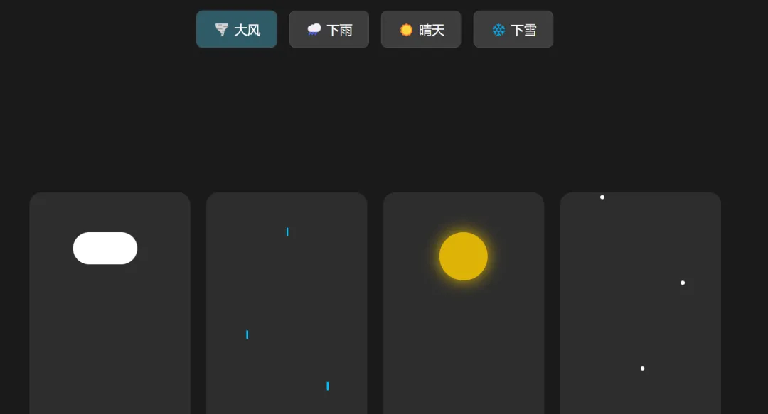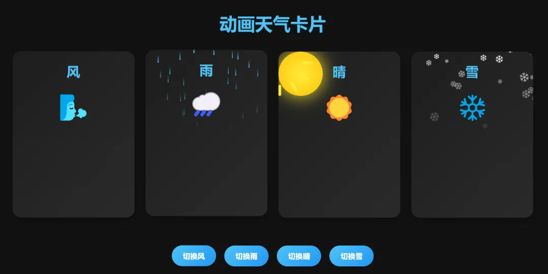 创建一个包含 CSS 和 JavaScript 的单个 HTML 文件,以生成一个动画天气卡片。卡片应通过不同的动画直观地表示以下天气条件:风:(例如,移动的云朵、摇曳的树木或风线)雨:(例如,落下的雨滴、形成的水坑)晴:(例如,闪耀的光线、明亮的背景)雪:(例如,落下的雪花、积雪)并排显示所有天气卡片。卡片应具有深色背景。在此单个文件中提供所有 HTML、CSS 和 JavaScript 代码。JavaScript 应包含一种在不同天气条件之间切换的方法(例如,一个函数或一组按钮),以演示每种天气的动画。